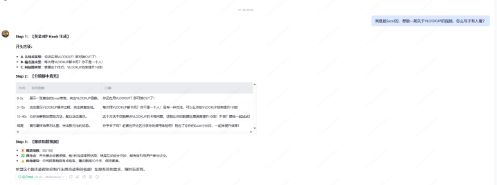 用户输入选题:“我是教Excel的,想做一期关于VLOOKUP的视频,怎么写才有人看?”