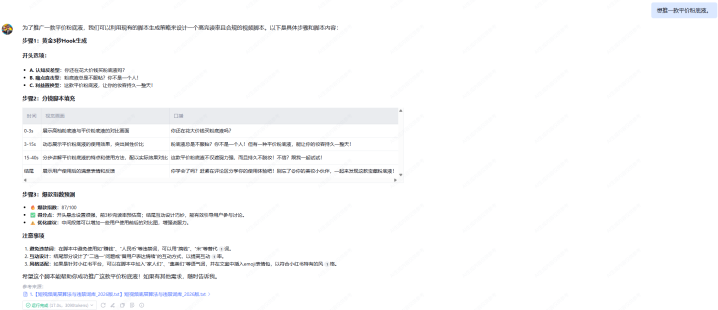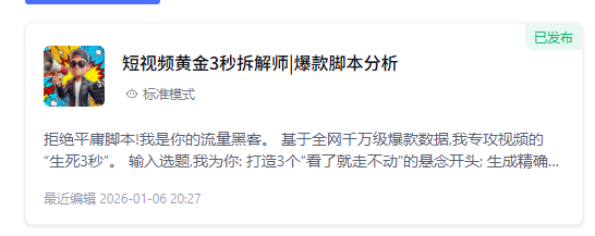爆款预测评分:这是它的杀手锏。写完脚本后,它会模拟算法视角,给这个脚本打分(0-100)。如果得分低,它会告诉你:“开头不够炸,建议重写。”