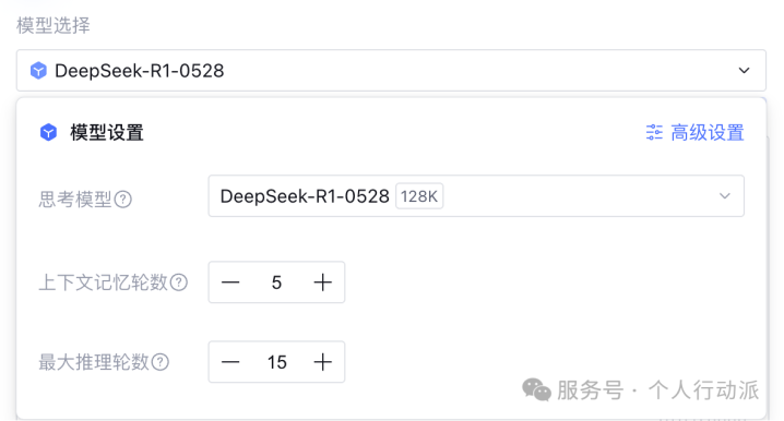 最大推力轮数:Agent在任务执行过程中「思考+工具调用」的轮数上限,超过后将基于当前结果生成回复。复杂任务建议增加轮数,但会增加token消耗。